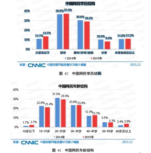 三是新媒体“受众”年轻化趋势日趋明显,人生观、价值观极易受到新媒体的冲击与影响。以第37次《中国互联网络发展状况统计报告》分析为例,2014年、2015年29岁以下网民占网民比高达56%、55%;2014年、2015年初中学历网民占比达36.8%、37.4%;2014年、2015年高中(技校、中专)学历网民占比达30.6%、29.4%;2014年、2015年大专学历网民占比为10.4%、8.4%;2014年、2015年本科及以上学历网民占比为11.0%、11.2%。