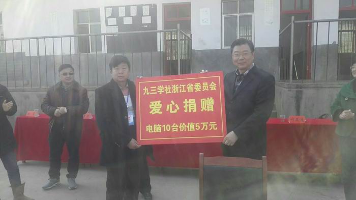 捐赠仪式上,社浙江省委为新光小学捐赠了价值5万元的10台笔记本电脑、价值4万余元的书籍2742册,浙江易凡投资有限公司董事长程建东向学校捐赠了价值3万元的70套学习座椅;参加仪式的领导一起见证了杭州育才教育集团(总校)副校长邹咏梅和新光小学校长胡勇签订两校友好帮扶合作的协议。