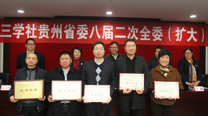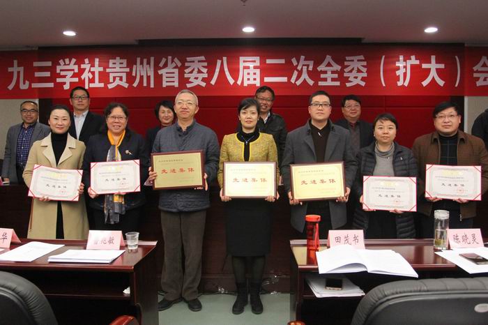 会议代九三学社中央对社黔南州委、社铜仁市委及金焱、左祥文、胡英明等3名社员颁发了“坚持和发展中国特色社会主义学习实践活动”先进集体和先进个人奖牌证书,对社贵阳市委、社遵义市委、社毕节市委、社省委经济委员会、社省委社会与法制委员会、社贵州财经大学支社、社贵州省委直属综合一支社等颁发参政议政工作先进集体证书,对朱虹、黄光祥、普兆敏、贺未泓、周永兰、宋毅、李胜君、余学军、刘济明、刘晓静、李伟、邹蕾、范德强等13名社员颁发参政议政先进个人证书。为鼓励各级社组织和广大社员积极参与调研,社省委还对2017年度的6篇优秀调研报告的承办单位进行了表彰。